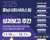 [HKSÇàÁ¤¹æ¼Û]Ãæ³²»çȸ¼ºñ½º¿ø(¿øÀå ±è¿µ¿Á)ÀÌ ¿À´Â 11¿ù 19ÀϺÎÅÍ 12¿ù 11ÀϱîÁö¸¦ ¡®2025 »çȸ¼ºñ½º¿ø ¼º°úº¸°í ÁÖ°£¡¯À¸·Î ÁöÁ¤Çϰí, ¿ÃÇØ ÃßÁøÇÑ »çȸ¼ºñ½º¡¤Ã»¼Ò³â¡¤Á¤Ã¥¿¬±¸ µî 3°³ ºÐ¾ß¿¡¼ ÃÑ 11°³ÀÇ ÁÖ¿ä »ç¾÷ ¼º°ú¸¦ µµ¹Î¿¡°Ô °ø°³ÇÏ´Â ´ë±Ô¸ð È«º¸ ±â°£¿¡ µé¾î°£´Ù. ±×µ¿¾È ºÐ¾ßº°·Î Èð¾îÁ® ÁøÇàµÇ´ø ¼º°úº¸°íȸ¸¦ ÇϳªÀÇ ¡®2025¡¦